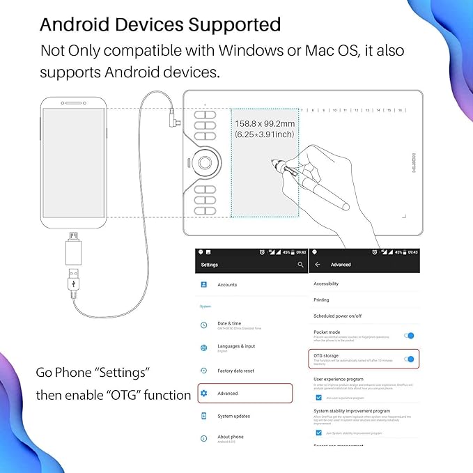 - OS Android 6.0 Supported: You can easily connect your phone to the tablet with the OTG connector. HUION HS610 is also compatible with Windows or Mac OS. IPhone and iPad are not avaliable, please be informed.