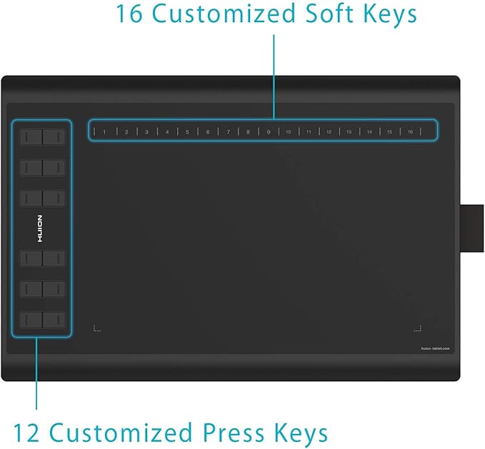 • Press Keys -12 programmable press keys plus 16 programmable soft keys, you can set shortcut keys on drawing tablet’s driver based on your preferences, such as erase, zoom in/out, scroll up and down, and so on.