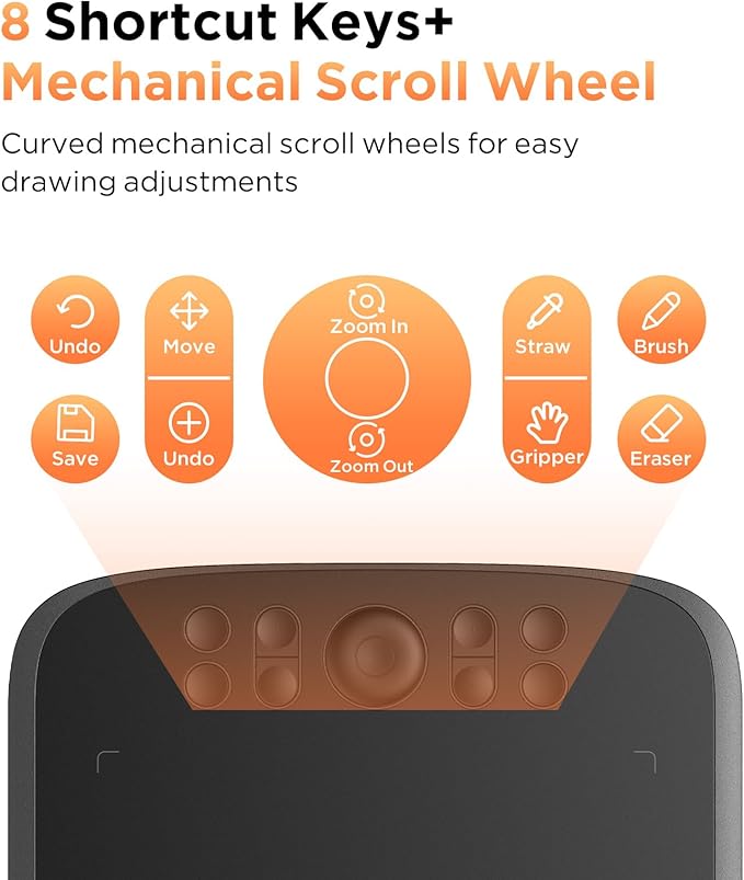 • [8 Shortcut Keys for Efficient Drawing] The M808 is equipped with 8 customizable shortcut keys conveniently positioned with a textured design for easy blind operation. The default settings include commonly used drawing tools such as pen, eraser, brush size adjustment, and undo, etc. You can also customize the shortcut keys through the computer according to your preferences.