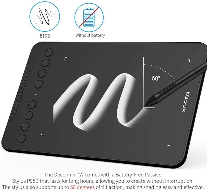 • Create without iinterruption: The Deco mini7W comes with a Battery-Free Passive Stylus P05D that lasts for long hour. It supports up to 60 degrees of tilt action, making shading easy and effective. With up to 8,192 pressure sensitivity levels, you can creates natural-looking lines of various widths.