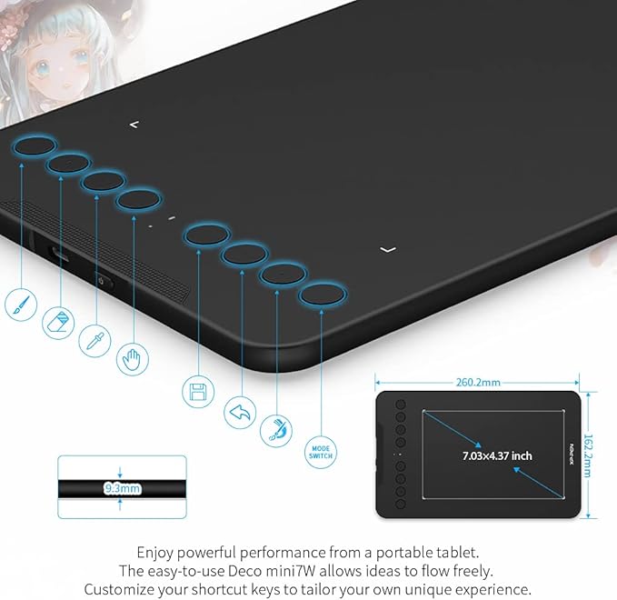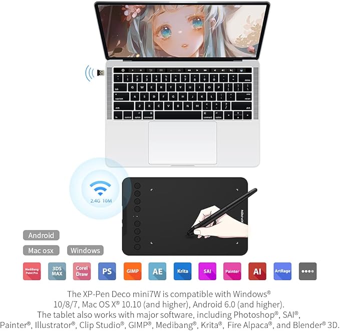 • Express yourself with freedom: The Deco mini7W supports connections with Android tablets and mobile phones. It’s compatible with Windows 10/8/7, Linux (Detailed versions), Mac OS X 10.10 (and higher), and Android 6.0 (and higher), Chrome OS 88.0.4324.109 and later. Also works with major software, including Photoshop, SAI, Painter, Illustrator, Clip Studio, GIMP, Medibang, Krita, Fire Alpaca, and Blender 3D.